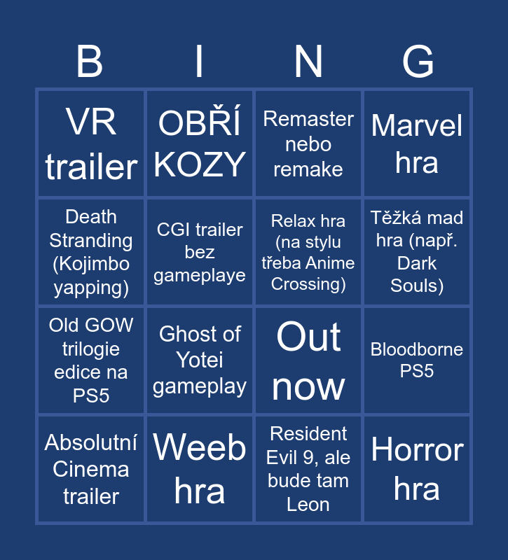 This bingo card has 16 words: Weeb hra, Bloodborne PS5, Remaster nebo remake, VR trailer, Old GOW trilogie edice na PS5, OBŘÍ KOZY, Out now, Resident Evil 9, ale bude tam Leon, Death Stranding (Kojimbo yapping), CGI trailer bez gameplaye, Absolutní Cinema trailer, Marvel hra, Ghost of Yotei gameplay, Těžká mad hra (např. Dark Souls), Relax hra (na stylu třeba Anime Crossing) and Horror hra.
