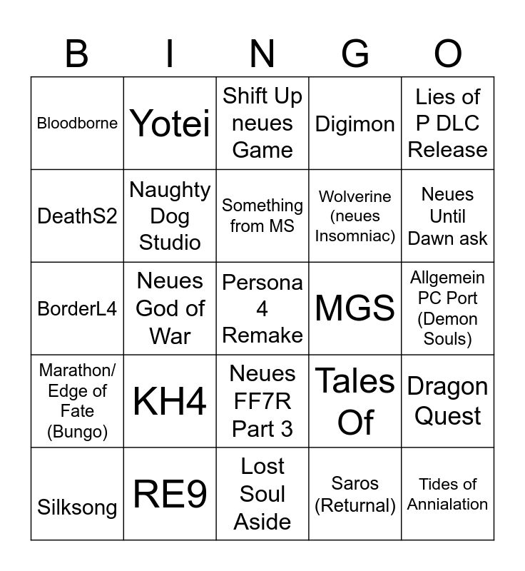 This bingo card has a free space and 24 words: KH4, RE9, Something from MS, Silksong, Lies of P DLC Release, Bloodborne, DeathS2, Yotei, MGS, Neues FF7R Part 3, Wolverine (neues Insomniac), BorderL4, Tales Of, Dragon Quest, Naughty Dog Studio, Saros (Returnal), Allgemein PC Port (Demon Souls), Shift Up neues Game, Neues Until Dawn ask, Neues God of War, Tides of Annialation, Marathon/ Edge of Fate (Bungo), Digimon and Lost Soul Aside.