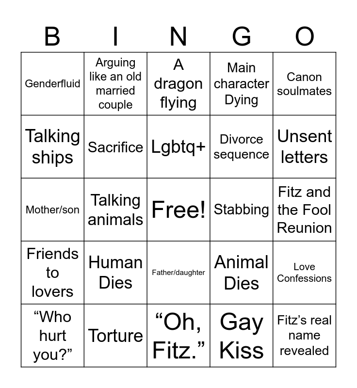This bingo card has a free space and 24 words: Human Dies, Torture, Lgbtq+, “Who hurt you?”, Canon soulmates, Genderfluid, Talking ships, Arguing like an old married couple, Stabbing, Father/daughter, Divorce sequence, Mother/son, Animal Dies, Love Confessions, Sacrifice, Gay Kiss, Fitz and the Fool Reunion, A dragon flying, Unsent letters, Talking animals, Fitz’s real name revealed, Friends to lovers, Main character Dying and “Oh, Fitz.”.
