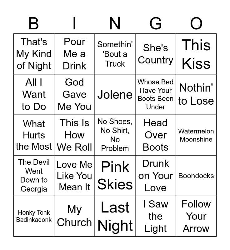 This bingo card has 36 words: Good Time, Neon Moon, Achy Breaky Heart, God Gave Me You, Drunk on Your Love, The Devil Went Down to Georgia, Jolene, Somewhere on a Beach, This Kiss, you look like you love me, This Is How We Roll, She's Country, John Deere Green, Head Over Boots, Nothin' to Lose, That's My Kind of Night, Follow Your Arrow, Love Me Like You Mean It, No Shoes, No Shirt, No Problem, Somethin' 'Bout a Truck, Watermelon Moonshine, Boondocks, My Church, Honky Tonk Badinkadonk, Last Night, Pour Me a Drink, What Hurts the Most, Smoky Mountain Rain, Whose Bed Have Your Boots Been Under, All I Want to Do, Fast Car, Xxx's and Ooo's (An American Girl), I Saw the Light, Pink Skies, Rhinestone Cowboy and A Country Boy Can Survive.