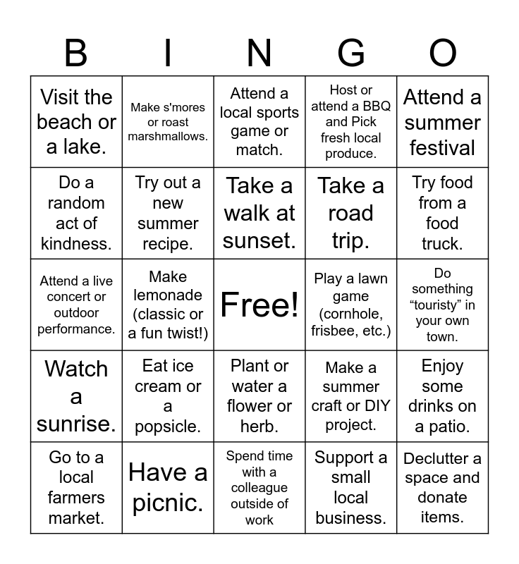 This bingo card has a free space and 24 words: Eat ice cream or a popsicle., Have a picnic., Take a walk at sunset., Go to a local farmers market., Attend a summer festival, Visit the beach or a lake., Do a random act of kindness., Make s'mores or roast marshmallows., Play a lawn game (cornhole, frisbee, etc.), Plant or water a flower or herb., Take a road trip., Attend a live concert or outdoor performance., Make a summer craft or DIY project., Enjoy some drinks on a patio., Try out a new summer recipe., Support a small local business., Do something “touristy” in your own town., Attend a local sports game or match., Try food from a food truck., Make lemonade (classic or a fun twist!), Declutter a space and donate items., Watch a sunrise., Host or attend a BBQ and Pick fresh local produce. and Spend time with a colleague outside of work.