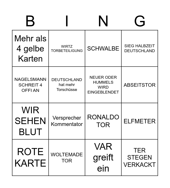 This bingo card has 16 words: WOLTEMADE TOR, ELFMETER, SCHWALBE, Mehr als 4 gelbe Karten, WIR SEHEN BLUT, WIRTZ TORBETEILIGUNG, RONALDO TOR, VAR greift ein, NAGELSMANN SCHREIT 4 OFFI AN, DEUTSCHLAND hat mehr Torschüsse, ROTE KARTE, SIEG HALBZEIT DEUTSCHLAND, Versprecher Kommentator, ABSEITSTOR, NEUER ODER HUMMELS WIRD EINGEBLENDET and TER STEGEN VERKACKT.