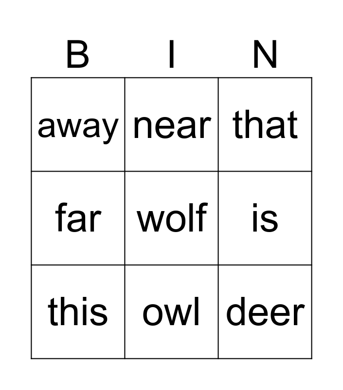 This bingo card has a free space and 9 words: this, that, near, far, away, is, deer, lion and owl.
