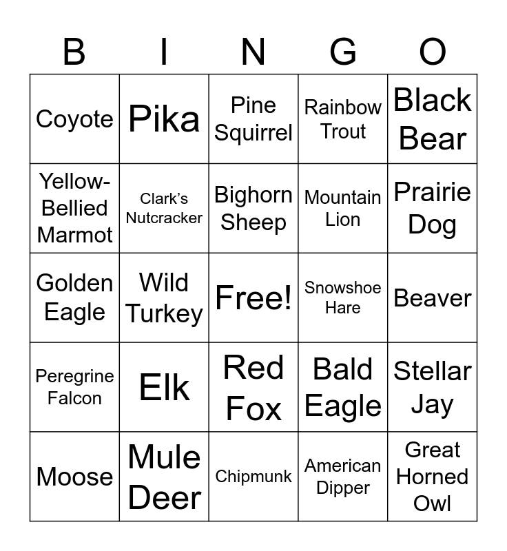 This bingo card has a free space and 24 words: Elk, Mule Deer, Bighorn Sheep, Moose, Black Bear, Coyote, Yellow-Bellied Marmot, Pika, Snowshoe Hare, Red Fox, Mountain Lion, Golden Eagle, Bald Eagle, Stellar Jay, Clark’s Nutcracker, American Dipper, Beaver, Pine Squirrel, Prairie Dog, Wild Turkey, Great Horned Owl, Peregrine Falcon, Rainbow Trout and Chipmunk.