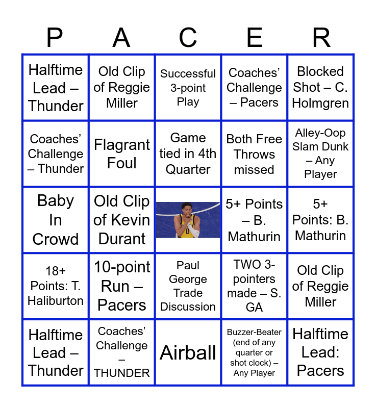 This bingo card has a free space and 95 words: TWO 3-pointers made – T. Haliburton, Blocked Shot – M. Turner, Buzzer-Beater (end of any quarter or shot clock) – Any Player, Technical Foul – Any Player, Foul Out (6 fouls) – Any Player, TWO Slam Dunks – O. Toppin, Coaches’ Challenge – PACERS, Coaches’ Challenge – THUNDER, Clips shown of Durant, Harden, and Westbrook as Thunder Teammates, Both Free Throws missed – Any Player, 3-point Play (make a basket + free throw) – Any Player, 10-point Run – Pacers, 10-point Run – Thunder, Game tied in 4th Quarter, Halftime Lead – Pacers, Halftime Lead – Thunder, Alley-Oop Slam Dunk – Any Player, TWO 3-ptrs – T. Haliburton, Blocked Shot – M. Turner, Buzzer-Beater (any quarter / shot clock), Technical Foul, Flagrant Foul, Foul Out (6 fouls), TWO Slam Dunks – O. Toppin, Coaches’ Challenge – Pacers, Coaches’ Challenge – Thunder, TWO 3-pointers made – P. Siakam, Both Free Throws missed, ONE 3-pointers made – A. Nesmith, Successful 3-point Play, 10-point Run – Pacers, 10-point Run – Thunder, Game tied in 4th Quarter, Halftime Lead – Pacers, Halftime Lead – Thunder, Alley-Oop Slam Dunk, Airball, Charging Foul, Baby In Crowd, Shot Clock Violation, Old Clip of Reggie Miller, Old Clip of Kevin Durant, Paul George Trade Discussion, Blocked Shot – C. Holmgren, TWO 3-pointers made – S. GA, 5+ Points – B. Mathurin, 18+ Points – T. Haliburton, 18+ Points – J. Williams, 25+ Points – S. GA, TWO 3-ptrs – J. Williams, 5+ Rebounds – M. Turner, 6+ Assist – T. Haliburton, 20+ Points – P. Siakam, 2+ Assists – T. McConnell, 6+ Assists – S. GA, 7+ Rebounds – C. Holmgren, TWO 3-ptrs: T. Haliburton, Blocked Shot: M. Turner, Buzzer-Beater (any quarter / shot clock), Technical Foul, Flagrant Foul, Foul Out (6 fouls), TWO Slam Dunks: O. Toppin, Coaches’ Challenge: Pacers, Coaches’ Challenge: Thunder, TWO 3-pointers made: P. Siakam, Both Free Throws missed, ONE 3-pointers made: A. Nesmith, Successful 3-point Play, 10-point Run: Pacers, 10-point Run: Thunder, Game tied in 4th Quarter, Halftime Lead: Pacers, Halftime Lead: Thunder, Alley-Oop Slam Dunk, Airball, Charging Foul, Baby In Crowd, Shot Clock Violation, Old Clip of Reggie Miller, Old Clip of Kevin Durant, Paul George Trade Discussion, Blocked Shot: C. Holmgren, TWO 3-pointers made: S. GA, 5+ Points: B. Mathurin, 18+ Points: T. Haliburton, 18+ Points: J. Williams, 25+ Points: S. GA, TWO 3-ptrs: J. Williams, 5+ Rebounds: M. Turner, 6+ Assist: T. Haliburton, 20+ Points: P. Siakam, 2+ Assists: T. McConnell, 6+ Assists: S. GA and 7+ Rebounds: C. Holmgren.