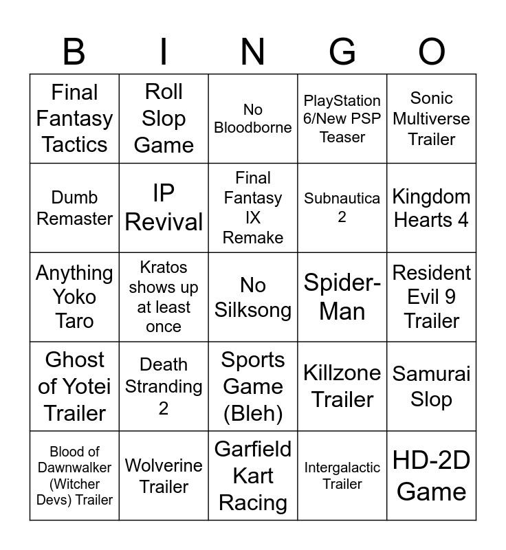 This bingo card has a free space and 24 words: Death Stranding 2, Wolverine Trailer, Final Fantasy IX Remake, Blood of Dawnwalker (Witcher Devs) Trailer, Sonic Multiverse Trailer, Final Fantasy Tactics, Dumb Remaster, Roll Slop Game, Spider-Man, Sports Game (Bleh), Subnautica 2, Anything Yoko Taro, Killzone Trailer, Samurai Slop, IP Revival, Intergalactic Trailer, Resident Evil 9 Trailer, No Bloodborne, Kingdom Hearts 4, Kratos shows up at least once, HD-2D Game, Ghost of Yotei Trailer, PlayStation 6/New PSP Teaser and Garfield Kart Racing.