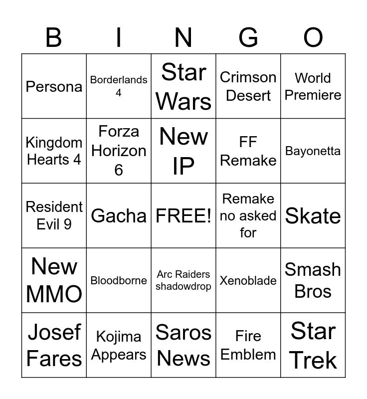 This bingo card has a free space and 24 words: Bloodborne, Kojima Appears, New IP, Josef Fares, World Premiere, Persona, Kingdom Hearts 4, Borderlands 4, Remake no asked for, Arc Raiders shadowdrop, FF Remake, Resident Evil 9, Xenoblade, Smash Bros, Forza Horizon 6, Fire Emblem, Skate, Star Wars, Bayonetta, Gacha, Star Trek, New MMO, Crimson Desert and Saros News.