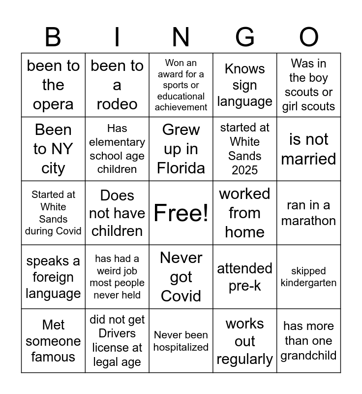This bingo card has a free space and 24 words: has had a weird job most people never held, did not get Drivers license at legal age, Grew up in Florida, Met someone famous, Was in the boy scouts or girl scouts, been to the opera, Been to NY city, been to a rodeo, worked from home, Never got Covid, started at White Sands 2025, Started at White Sands during Covid, attended pre-k, skipped kindergarten, Has elementary school age children, works out regularly, ran in a marathon, Won an award for a sports or educational achievement, is not married, Does not have children, has more than one grandchild, speaks a foreign language, Knows sign language and Never been hospitalized.