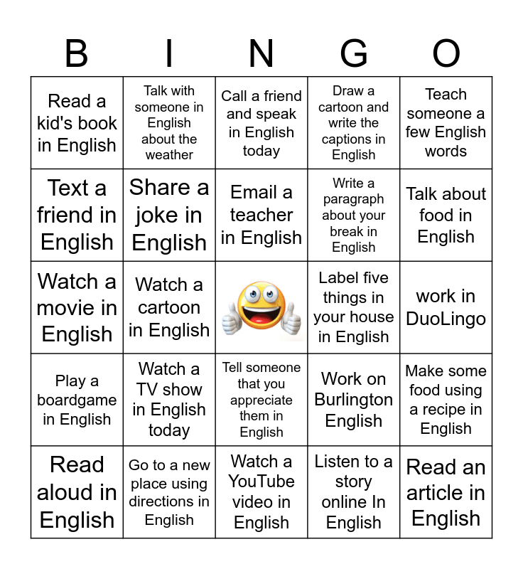 This bingo card has a free space and 24 words: Watch a TV show in English today, Go to a new place using directions in English, Email a teacher in English, Read aloud in English, Teach someone a few English words, Read a kid's book in English, Text a friend in English, Talk with someone in English about the weather, Label five things in your house in English, Tell someone that you appreciate them in English, Write a paragraph about your break in English, Watch a movie in English, Work on Burlington English, Make some food using a recipe in English, Share a joke in English, Listen to a story online In English, work in DuoLingo, Call a friend and speak in English today, Talk about food in English, Watch a cartoon in English, Read an article in English, Play a boardgame in English, Draw a cartoon and write the captions in English and Watch a YouTube video in English.