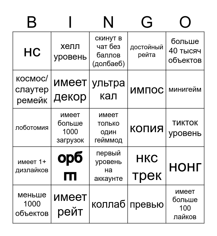 This bingo card has a free space and 24 words: орб гп, имеет рейт, ультра кал, меньше 1000 объектов, больше 40 тысяч объектов, нс, космос/слаутер ремейк, хелл уровень, копия, первый уровень на аккаунте, импос, лоботомия, нкс трек, нонг, имеет декор, превью, тикток уровень, скинут в чат без баллов (долбаеб), минигейм, имеет больше 1000 загрузок, имеет больше 100 лайков, имеет 1+ дизлайков, достойный рейта and коллаб.