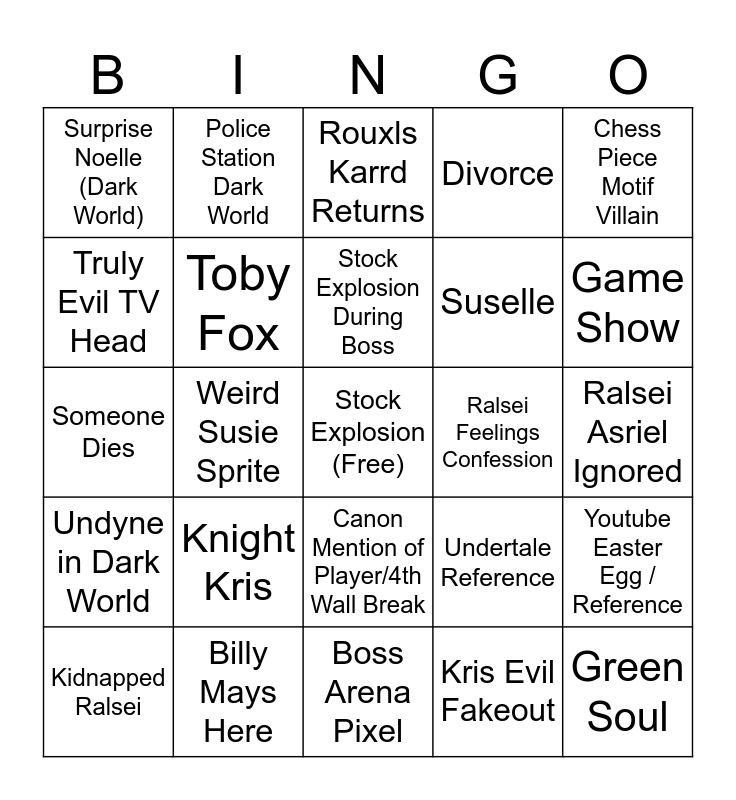 This bingo card has a free space and 24 words: Knight Kris, Billy Mays Here, Stock Explosion During Boss, Kidnapped Ralsei, Chess Piece Motif Villain, Surprise Noelle (Dark World), Truly Evil TV Head, Police Station Dark World, Ralsei Feelings Confession, Canon Mention of Player/4th Wall Break, Suselle, Someone Dies, Undertale Reference, Youtube Easter Egg / Reference, Toby Fox, Kris Evil Fakeout, Ralsei Asriel Ignored, Rouxls Karrd Returns, Game Show, Weird Susie Sprite, Green Soul, Undyne in Dark World, Divorce and Boss Arena Pixel.