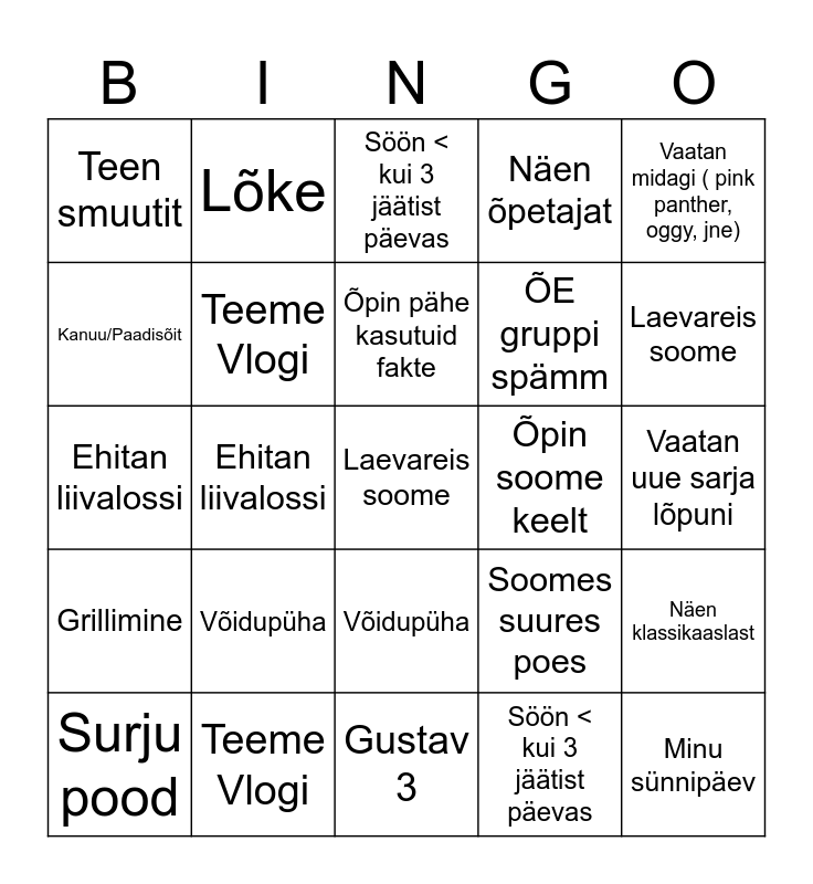 ⚠ This card has duplicate items: Laulupeo proov (2), Laevareis soome (2), Surju pood (2), Gustav 3 (2), Võidupüha (2), Grillimine (2), Lõke (2), Karjääris ujumas (2), Kanuu/Paadisõit (2), Söön midagi mida pole kunagi söönud (2), Teeme Vlogi (2), Näen õpetajat (2), Näen klassikaaslast (2), Soomes suures poes (2), Vaatan uue sarja lõpuni (2), Teen suve playlisti (2), Õpin pähe kasutuid fakte (2), Õpin soome keelt (2), Minu sünnipäev (2), Vaatan midagi ( pink panther, oggy, jne) (2), Ehitan liivalossi (2), Söön < kui 3 jäätist päevas (2), Teen smuutit (2), ÕE gruppi spämm (2)