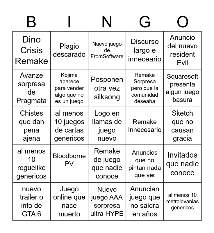 This bingo card has a free space and 24 words: Bloodborne PV, Juego online que nace muerto, Posponen otra vez silksong, nuevo trailer o info de GTA 6, Anuncio del nuevo resident Evil, Dino Crisis Remake, Avanze sorpresa de Pragmata, Plagio descarado, Remake Innecesario, Remake de juego que nadie conoce, Remake Sorpresa pero que la comunidad deseaba, Chistes que dan pena ajena, Anuncios que no pintan nada que ver, Invitados que nadie conoce, Kojima aparece para vender algo que no es un juego, Anuncian juego que no saldra en años, Sketch que no causan gracia, Nuevo juego de FromSoftware, Squaresoft presenta algun juego basura, al menos 10 juegos de cartas genericos, al menos 10 metroidvanias genericos, al menos 10 roguelike genericos, Discurso largo e inneceario and Nuevo juego AAA sorpresa ultra HYPE.