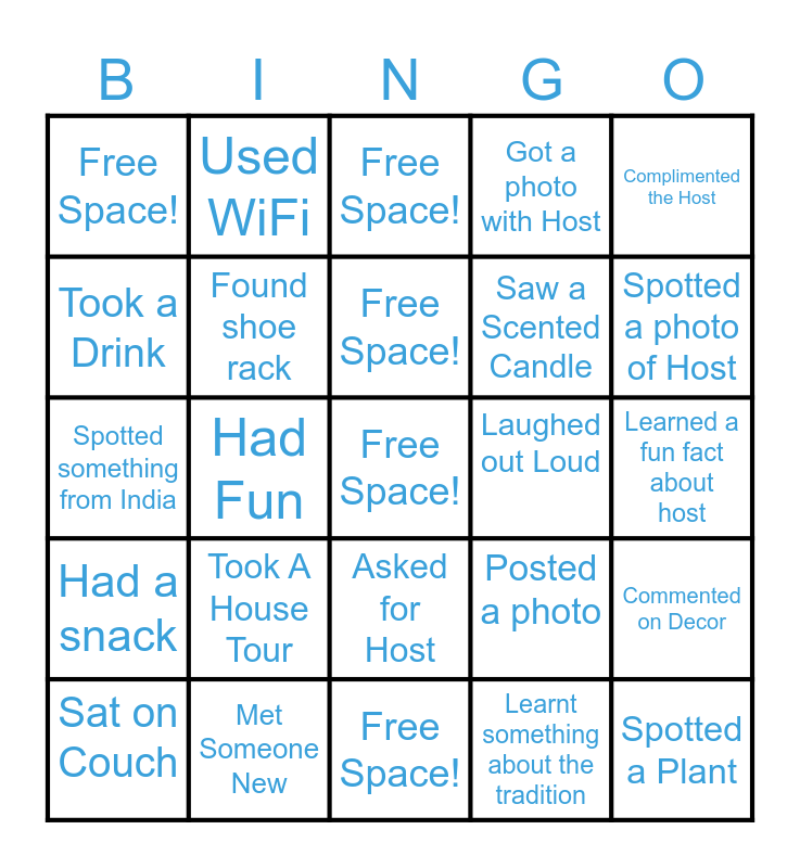 This bingo card has a free space and 24 words: Took A House Tour, Met Someone New, Free Space!, Sat on Couch, Complimented the Host, Free Space!, Took a Drink, Used WiFi, Laughed out Loud, Asked for Host, Saw a Scented Candle, Spotted something from India, Posted a photo, Commented on Decor, Found shoe rack, Learnt something about the tradition, Learned a fun fact about host, Free Space!, Spotted a photo of Host, Had Fun, Spotted a Plant, Had a snack, Got a photo with Host and Free Space!.
