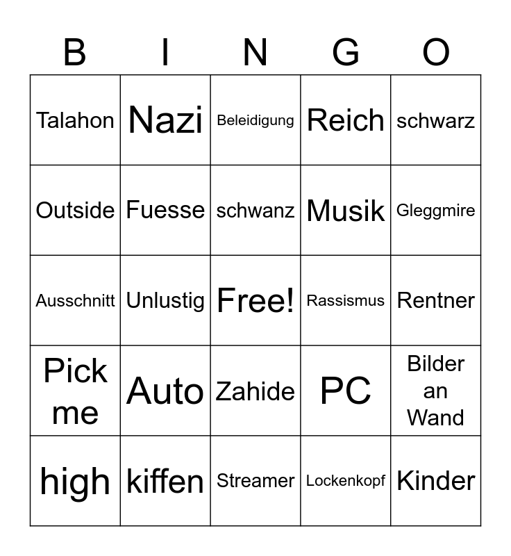 This bingo card has a free space and 24 words: Auto, kiffen, schwanz, high, schwarz, Talahon, Outside, Nazi, Rassismus, Zahide, Musik, Ausschnitt, PC, Bilder an Wand, Fuesse, Lockenkopf, Rentner, Beleidigung, Gleggmire, Unlustig, Kinder, Pick me, Reich and Streamer.