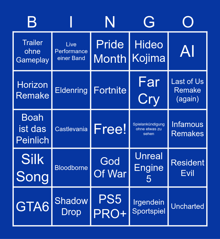 This bingo card has a free space and 24 words: GTA6, Bloodborne, Fortnite, Irgendein Sportspiel, AI, Trailer ohne Gameplay, Live Performance einer Band, Pride Month, Spielankündigung ohne etwas zu sehen, Infamous Remakes, Boah ist das Peinlich, Eldenring, Unreal Engine 5, Resident Evil, Horizon Remake, Shadow Drop, PS5 PRO+, Hideo Kojima, Last of Us Remake (again), Silk Song, Castlevania, God Of War, Far Cry and Uncharted.