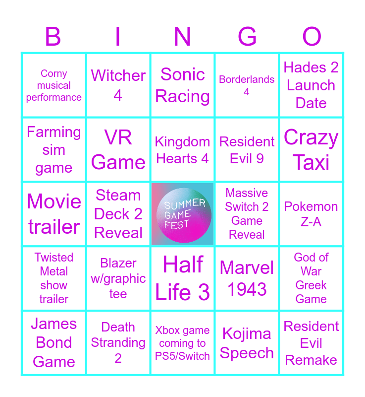 This bingo card has a free space and 24 words: Blazer w/graphic tee, Death Stranding 2, Kingdom Hearts 4, James Bond Game, Hades 2 Launch Date, Corny musical performance, Farming sim game, Witcher 4, Massive Switch 2 Game Reveal, Half Life 3, Resident Evil 9, Movie trailer, Marvel 1943, God of War Greek Game, VR Game, Kojima Speech, Pokemon Z-A, Sonic Racing, Crazy Taxi, Steam Deck 2 Reveal, Resident Evil Remake, Twisted Metal show trailer, Borderlands 4 and Xbox game coming to PS5/Switch.