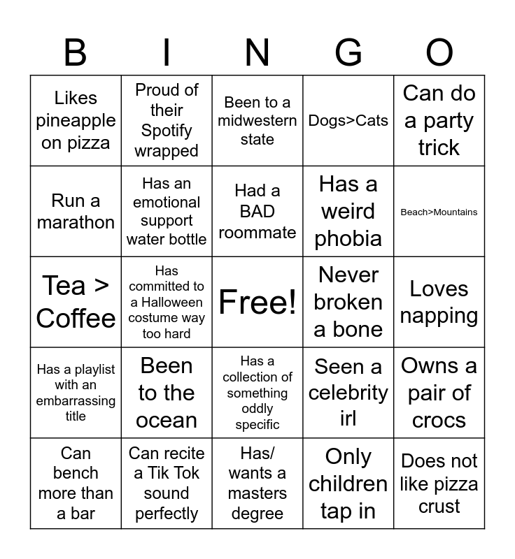 This bingo card has a free space and 24 words: Been to the ocean, Can recite a Tik Tok sound perfectly, Had a BAD roommate, Can bench more than a bar, Can do a party trick, Likes pineapple on pizza, Run a marathon, Proud of their Spotify wrapped, Never broken a bone, Has a collection of something oddly specific, Has a weird phobia, Tea > Coffee, Seen a celebrity irl, Owns a pair of crocs, Has an emotional support water bottle, Only children tap in, Loves napping, Been to a midwestern state, Beach>Mountains, Has committed to a Halloween costume way too hard, Does not like pizza crust, Has a playlist with an embarrassing title, Dogs>Cats and Has/ wants a masters degree.