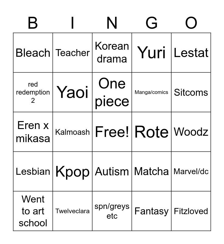 This bingo card has a free space and 24 words: Kpop, Twelveclara, One piece, Went to art school, Lestat, Bleach, red redemption 2, Teacher, Rote, Autism, Manga/comics, Eren x mikasa, Matcha, Marvel/dc, Yaoi, Fantasy, Woodz, Korean drama, Sitcoms, Kalmoash, Fitzloved, Lesbian, Yuri and spn/greys etc.