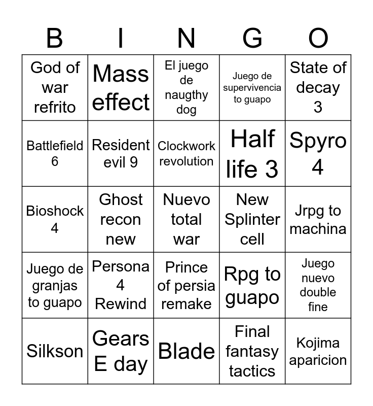 This bingo card has a free space and 24 words: Persona 4 Rewind, Gears E day, Clockwork revolution, Silkson, State of decay 3, God of war refrito, Battlefield 6, Mass effect, New Splinter cell, Prince of persia remake, Half life 3, Bioshock 4, Rpg to guapo, Juego nuevo double fine, Resident evil 9, Final fantasy tactics, Jrpg to machina, El juego de naugthy dog, Spyro 4, Ghost recon new, Kojima aparicion, Juego de granjas to guapo, Juego de supervivencia to guapo and Blade.