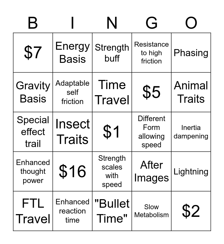 This bingo card has 25 words: $16, "Bullet Time", Time Travel, FTL Travel, Phasing, $7, Gravity Basis, Energy Basis, Different Form allowing speed, Strength scales with speed, $5, Special effect trail, After Images, Lightning, Adaptable self friction, $2, Inertia dampening, Strength buff, Animal Traits, Insect Traits, $1, Enhanced reaction time, Enhanced thought power, Resistance to high friction and Slow Metabolism.