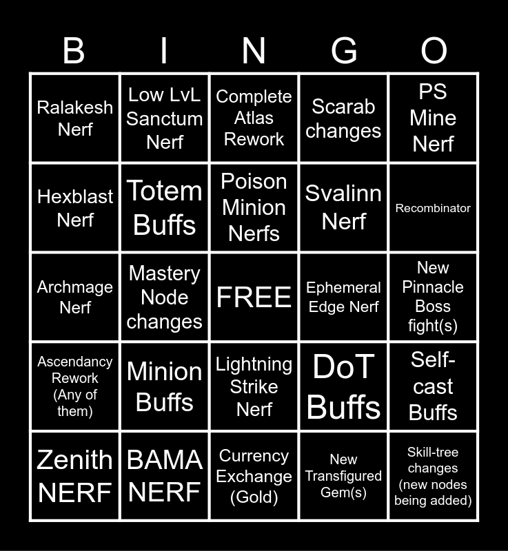 This bingo card has a free space and 24 words: Minion Buffs, BAMA NERF, Poison Minion Nerfs, Zenith NERF, PS Mine Nerf, Ralakesh Nerf, Hexblast Nerf, Low LvL Sanctum Nerf, Ephemeral Edge Nerf, Lightning Strike Nerf, Svalinn Nerf, Archmage Nerf, DoT Buffs, Self-cast Buffs, Totem Buffs, New Transfigured Gem(s), New Pinnacle Boss fight(s), Complete Atlas Rework, Recombinator, Mastery Node changes, Skill-tree changes (new nodes being added), Ascendancy Rework (Any of them), Scarab changes and Currency Exchange (Gold).