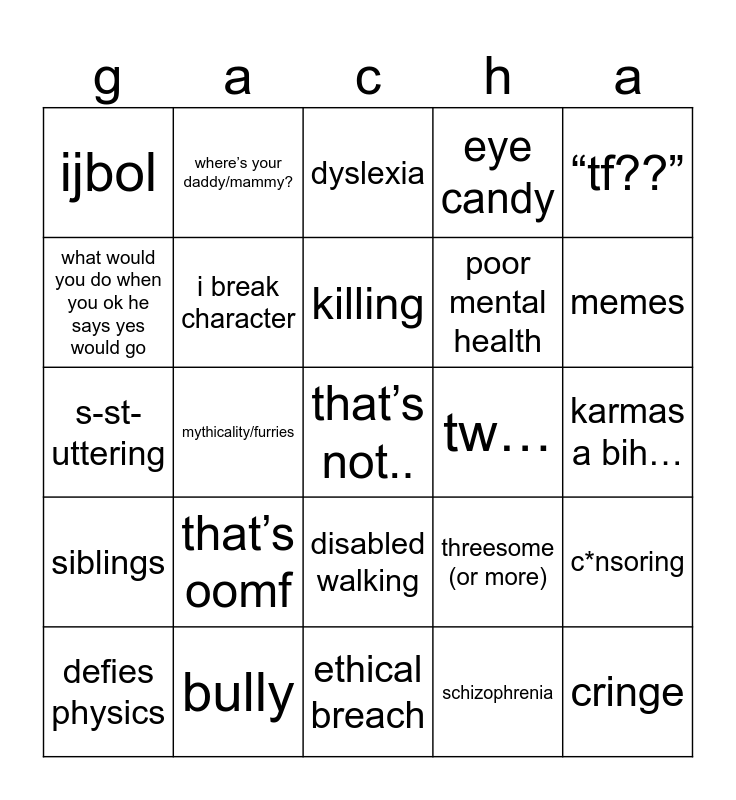 This bingo card has a free space and 24 words: that’s oomf, bully, killing, defies physics, “tf??”, ijbol, what would you do when you ok he says yes would go, where’s your daddy/mammy?, tw…, disabled walking, poor mental health, s-st-uttering, threesome (or more), c*nsoring, i break character, schizophrenia, karmas a bih…, dyslexia, memes, mythicality/furries, cringe, siblings, eye candy and ethical breach.