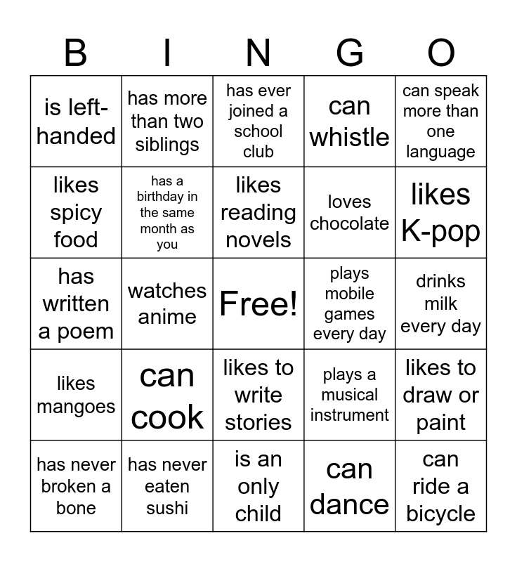 This bingo card has a free space and 50 words: has a pet, can ride a bicycle, wears glasses, is an only child, can cook, can sing an English song, has more than two siblings, has traveled to another province, likes spicy food, is afraid of spiders, has a birthday in the same month as you, can whistle, likes to draw or paint, plays a musical instrument, can swim, has been to the beach this year, likes reading novels, plays mobile games every day, is taller than you, can speak more than one language, watches anime, can dance, is left-handed, loves chocolate, likes math, has the same favorite color as you, likes K-pop, can name five animals in English, has ever joined a school club, likes to write stories, has a funny laugh, is afraid of heights, can do a magic trick, likes watching cartoons, has never eaten sushi, can name 5 fruits in English, has a nickname with 3 letters, plays football (soccer), likes to eat ice cream in winter, drinks milk every day, likes horror movies, has a lucky item (like a charm or necklace), has helped a friend with homework, likes waking up early, has never broken a bone, has written a poem, laughs a lot, can spell your name backward, likes mangoes and wants to travel abroad someday.