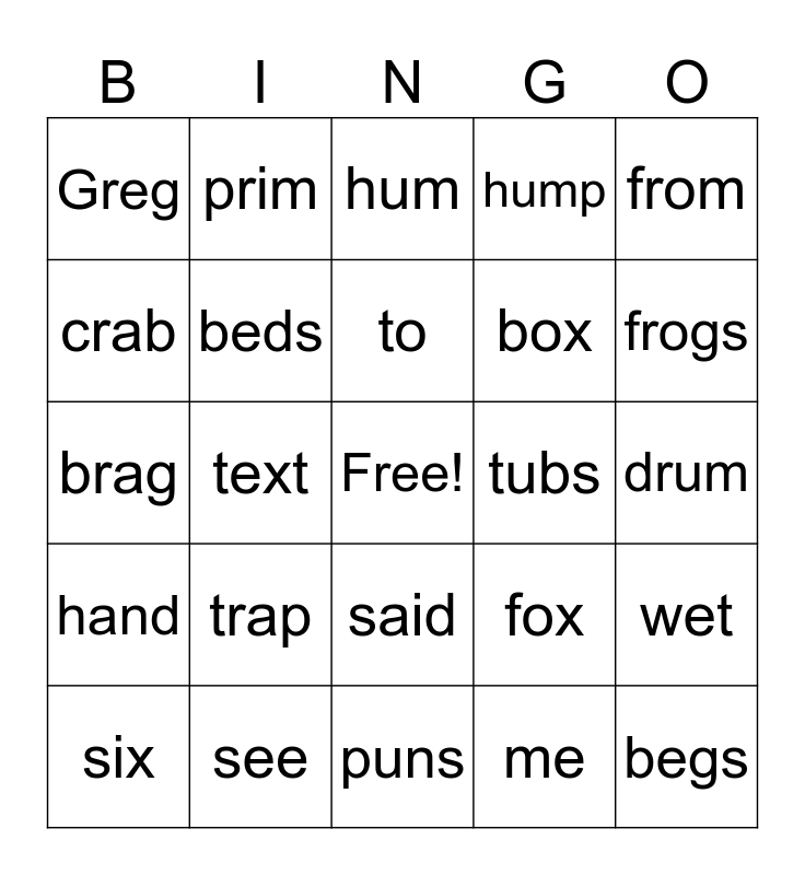 This bingo card has a free space and 26 words: said, me, to, see, from, Greg, crab, prim, drum, fox, box, brag, wet, six, text, husk, hump, hand, hum, begs, frogs, puns, tubs, trap, beds and skit.