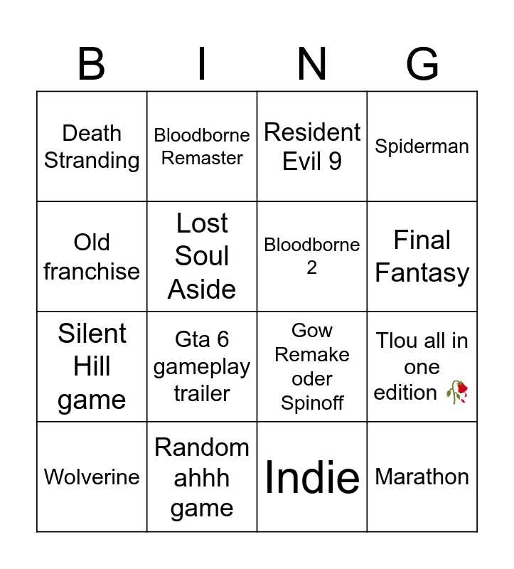 This bingo card has 16 words: Random ahhh game, Tlou all in one edition 🥀, Resident Evil 9, Death Stranding, Silent Hill game, Bloodborne Remaster, Gow Remake oder Spinoff, Indie, Old franchise, Lost Soul Aside, Wolverine, Spiderman, Gta 6 gameplay trailer, Final Fantasy, Bloodborne 2 and Marathon.
