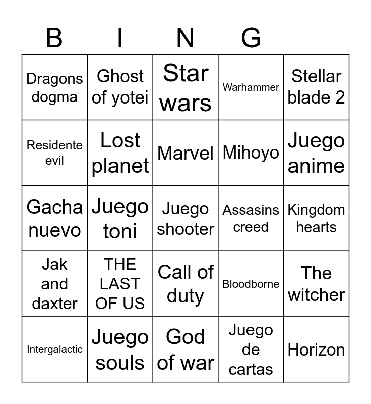 This bingo card has 25 words: THE LAST OF US, God of war, Marvel, Intergalactic, Stellar blade 2, Dragons dogma, Residente evil, Ghost of yotei, Assasins creed, Call of duty, Mihoyo, Gacha nuevo, Bloodborne, The witcher, Lost planet, Horizon, Kingdom hearts, Star wars, Juego anime, Juego toni, Juego shooter, Juego souls, Jak and daxter, Warhammer and Juego de cartas.