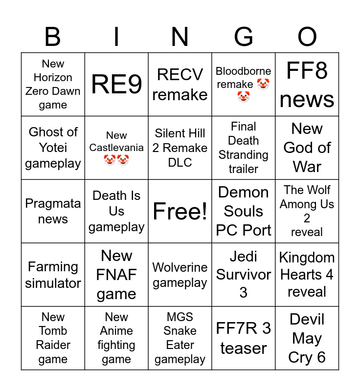 This bingo card has a free space and 24 words: New FNAF game, New Anime fighting game, Silent Hill 2 Remake DLC, New Tomb Raider game, FF8 news, New Horizon Zero Dawn game, Ghost of Yotei gameplay, RE9, Demon Souls PC Port, Wolverine gameplay, Final Death Stranding trailer, Pragmata news, Jedi Survivor 3, Kingdom Hearts 4 reveal, New Castlevania 🤡🤡, FF7R 3 teaser, The Wolf Among Us 2 reveal, RECV remake, New God of War, Death Is Us gameplay, Devil May Cry 6, Farming simulator, Bloodborne remake 🤡🤡 and MGS Snake Eater gameplay.