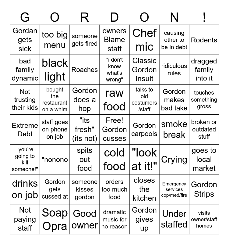 This bingo card has a free space and 62 words: Gordon does property damage, Extreme Debt, Ugly decor, bought the restaurant on a whim, visits owner/staff homes, Gordon Strips, Rodents, 86 all night long, black light, Not paying staff, owners Blame staff, orders too much food, causing other to be in debt, Gordon carpools, incompetent Chef, Gordan gets sick, ridiculous rules, Chef mic, "can you just taste that?", bad family dynamic, dragged family into it, someone gets fired, touches something gross, "its fresh" (its not), "i like the food", "look at it!", "nonono, Mold, Gordon makes bad take, goes to local market, therapist Gordon, someone kisses gordon, Under staffed, Chefs don't taste food, Not trusting their kids, too big menu, closes the kitchen, Crying, Classic Gordon Insult, smoke break, "i don't know what's wrong", Emergency services cop/med/fire, Gordon does a hop, burnt food, Roaches, talks to old costumers /staff, spits out food, Soap Opra, dramatic music for no reason, Gordon gives up, raw food, staff goes on phone on job, Week+ Old Food, Gordon gets cussed at, That's A Crime, broken or outdated stuff, cold food, drinks on job, Good owner, uninspired staff, "you're going to kill someone!" and there on somethin.