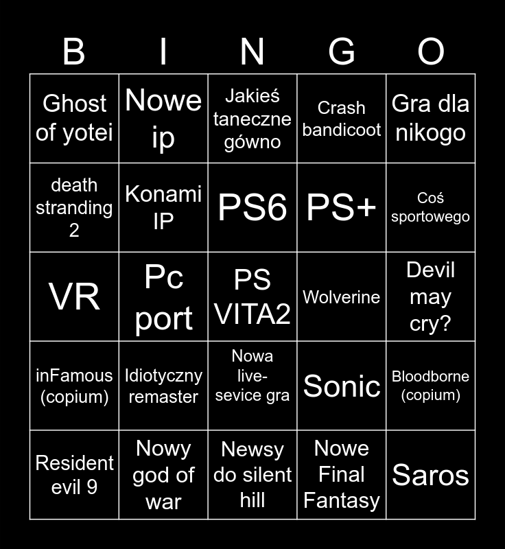 This bingo card has a free space and 24 words: Idiotyczny remaster, Nowy god of war, PS6, Resident evil 9, Gra dla nikogo, Ghost of yotei, death stranding 2, Nowe ip, Wolverine, Nowa live-sevice gra, PS+, VR, Sonic, Bloodborne (copium), Konami IP, Nowe Final Fantasy, Devil may cry?, Jakieś taneczne gówno, Coś sportowego, Pc port, Saros, inFamous (copium), Crash bandicoot and Newsy do silent hill.