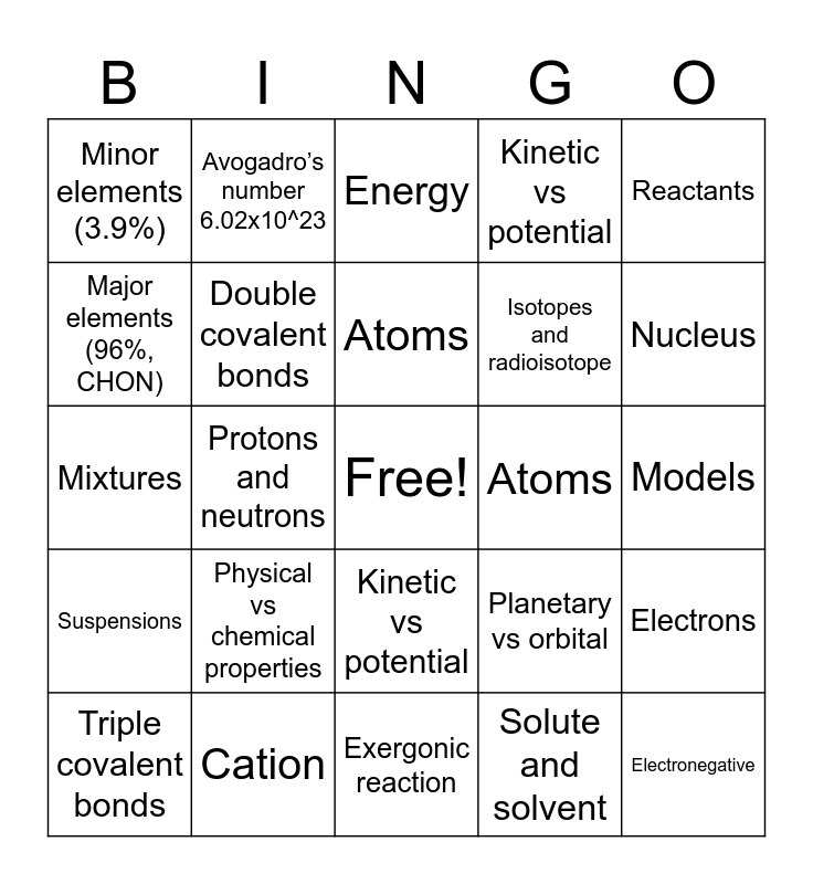 This bingo card has a free space and 88 words: Matter, Energy, Kinetic vs potential, Chemical, electrical, mechanical, electromagnetic, Elements, Physical vs chemical properties, Major elements (96%, CHON), Minor elements (3.9%), Trace elements (0.1%), Atomic structure, Nucleus, Protons and neutrons, Electrons, Models, Planetary vs orbital, Atoms, Atomic symbol, Atomic number, Atomic mass, Atomic weight, Isotopes and radioisotope, Molecules vs compounds, Mixtures, Solutions, Solute and solvent, Homogenous, Colloids, Suspensions, Avogadro’s number 6.02x10^23, Matter, Energy, Kinetic vs potential, Chemical, electrical, mechanical, electromagnetic, Elements, Physical vs chemical properties, Major elements (96%, CHON), Minor elements (3.9%), Trace elements (0.1%), Atomic structure, Nucleus, Protons and neutrons, Electrons, Models, Planetary vs orbital, Atoms, Atomic symbol, Atomic number, Atomic mass, Atomic weight, Isotopes and radioisotope, Molecules vs compounds, Mixtures, Solutions, Solute and solvent, Homogenous, Colloids, Suspensions, Avogadro’s number 6.02x10^23, Chemical bonds, Electron shells/ energy levels, Valence shell, Octet rule, 3 types of bonds, Ionic, covalent, hydrogen, Anion, Cation, Single covalent bonds, Double covalent bonds, Triple covalent bonds, Electronegative, Electropositive, Water = universal solvent, Chemical reactions, Reactants, Products, Redox reaction, Oxidation rection, Reduction reaction, Exergonic reaction, Endergonic reaction, Factors that influence rate of reactions, Temperature, particle size, concentration, Catalyst, Enzyme, 2 types of compounds, Organic compounds, Inorganic compounds and Properties of water.