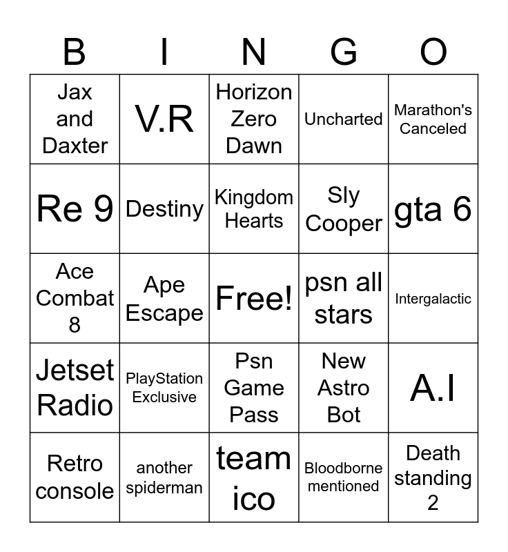 This bingo card has a free space and 32 words: Bloodborne mentioned, Remaster / Remake, Ape Escape, Crazy Taxi, Jetset Radio, Destiny, Marathon's Canceled, A.I, V.R, Five Nights At fernando's, Kingdom Hearts, Horizon Zero Dawn, Black myth wukong dlc, Psn Tornaments, psn all stars, New Controller, Retro console, Ace Combat 8, Psn Game Pass, PlayStation Exclusive, New Astro Bot, Hollow knight SilkSong, Intergalactic, another spiderman, Death standing 2, Uncharted, Sly Cooper, Re 9, Jax and Daxter, team ico, infamous and gta 6.