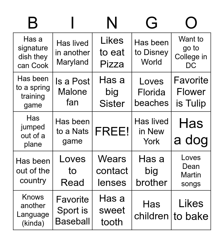 This bingo card has a free space and 24 words: Loves to Read, Favorite Sport is Baseball, Has a big Sister, Knows another Language (kinda), Want to go to College in DC, Has a signature dish they can Cook, Has been to a spring training game, Has lived in another Maryland, Has lived in New York, Wears contact lenses, Loves Florida beaches, Has jumped out of a plane, Has a big brother, Loves Dean Martin songs, Is a Post Malone fan, Has children, Has a dog, Likes to eat Pizza, Favorite Flower is Tulip, Has been to a Nats game, Likes to bake, Has been out of the country, Has been to Disney World and Has a sweet tooth.