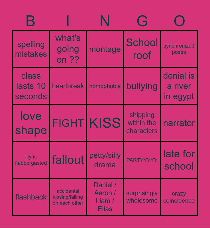 This bingo card has a free space and 24 words: fallout, accidental kissing/falling on each other, homophobia, flashback, synchronized poses, spelling mistakes, class lasts 10 seconds, what's going on ??, shipping within the characters, petty/silly drama, bullying, love shape, PARTYYYYY, late for school, heartbreak, surprisingly wholesome, narrator, montage, denial is a river in egypt, FIGHT, crazy coincidence, lily is flabbergasted, School roof and Daniel / Aaron / Liam / Elias.