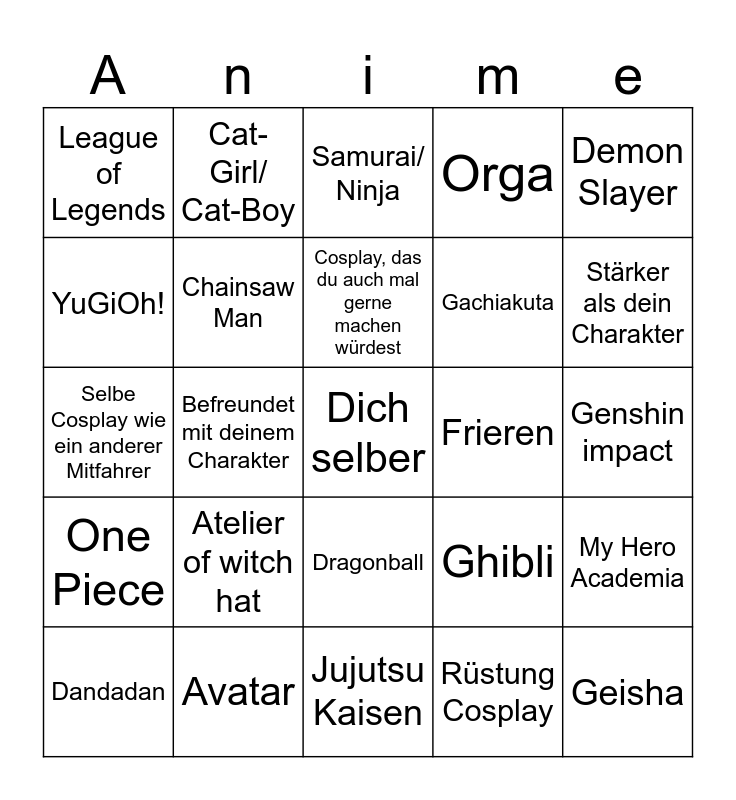 This bingo card has a free space and 24 words: Atelier of witch hat, Avatar, Cosplay, das du auch mal gerne machen würdest, Dandadan, Demon Slayer, League of Legends, YuGiOh!, Cat-Girl/ Cat-Boy, Frieren, Dragonball, Gachiakuta, Selbe Cosplay wie ein anderer Mitfahrer, Ghibli, My Hero Academia, Chainsaw Man, Rüstung Cosplay, Genshin impact, Samurai/ Ninja, Stärker als dein Charakter, Befreundet mit deinem Charakter, Geisha, One Piece, Orga and Jujutsu Kaisen.