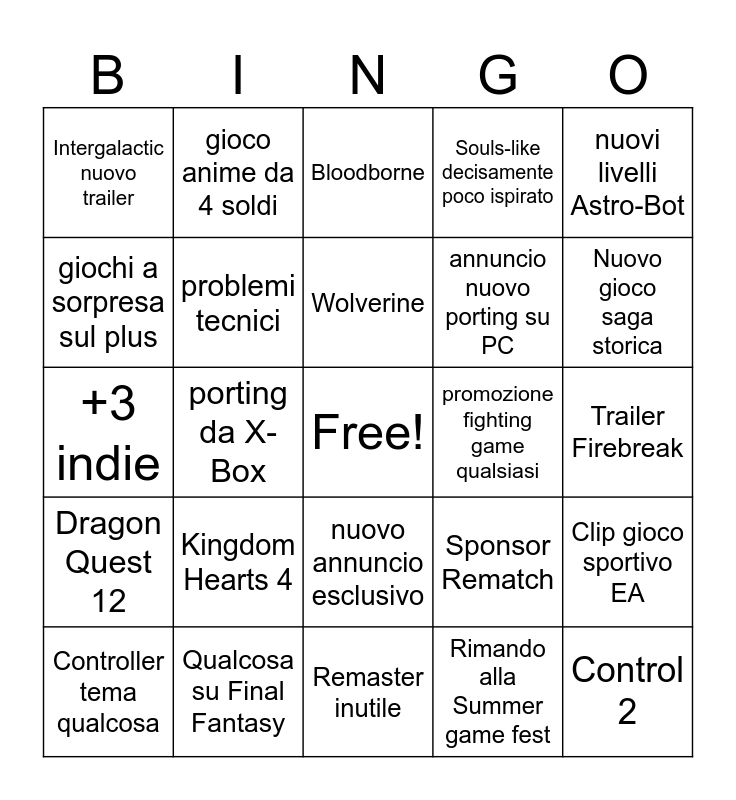 This bingo card has a free space and 24 words: Kingdom Hearts 4, Qualcosa su Final Fantasy, Wolverine, Controller tema qualcosa, nuovi livelli Astro-Bot, Intergalactic nuovo trailer, giochi a sorpresa sul plus, gioco anime da 4 soldi, promozione fighting game qualsiasi, nuovo annuncio esclusivo, annuncio nuovo porting su PC, +3 indie, Sponsor Rematch, Clip gioco sportivo EA, problemi tecnici, Rimando alla Summer game fest, Trailer Firebreak, Bloodborne, Nuovo gioco saga storica, porting da X-Box, Control 2, Dragon Quest 12, Souls-like decisamente poco ispirato and Remaster inutile.