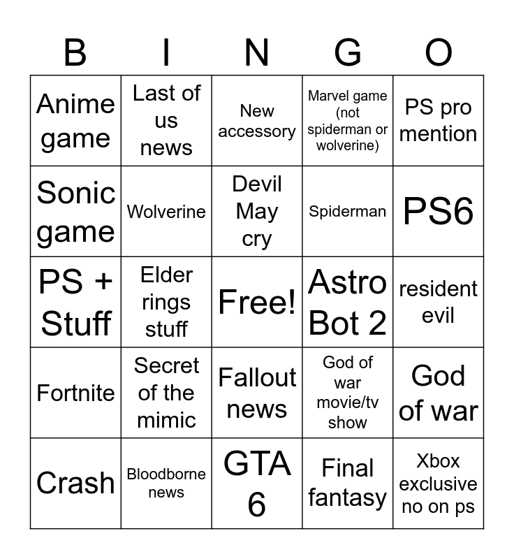 This bingo card has a free space and 24 words: Secret of the mimic, Bloodborne news, Devil May cry, Crash, PS pro mention, Anime game, Sonic game, Last of us news, Astro Bot 2, Fallout news, Spiderman, PS + Stuff, God of war movie/tv show, God of war, Wolverine, Final fantasy, resident evil, New accessory, PS6, Elder rings stuff, Xbox exclusive no on ps, Fortnite, Marvel game (not spiderman or wolverine) and GTA 6.