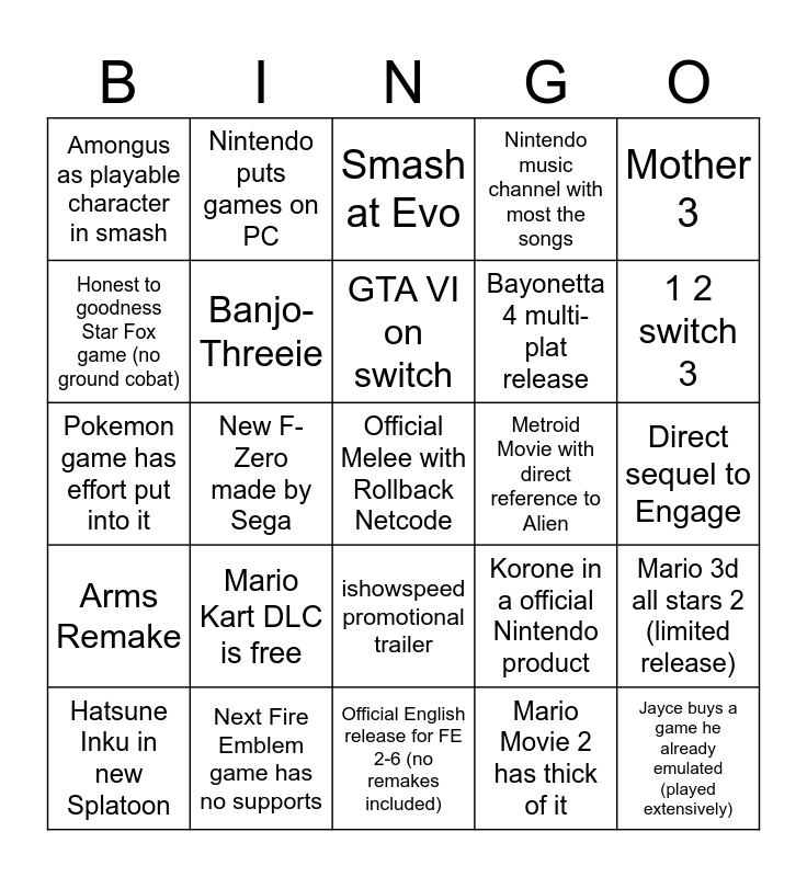 This bingo card has a free space and 24 words: Mario Kart DLC is free, Next Fire Emblem game has no supports, GTA VI on switch, Hatsune Inku in new Splatoon, Mother 3, Amongus as playable character in smash, Honest to goodness Star Fox game (no ground cobat), Nintendo puts games on PC, Metroid Movie with direct reference to Alien, ishowspeed promotional trailer, Bayonetta 4 multi-plat release, Pokemon game has effort put into it, Korone in a official Nintendo product, Mario 3d all stars 2 (limited release), Banjo-Threeie, Mario Movie 2 has thick of it, Direct sequel to Engage, Smash at Evo, 1 2 switch 3, New F-Zero made by Sega, Jayce buys a game he already emulated (played extensively), Arms Remake, Nintendo music channel with most the songs and Official English release for FE 2-6 (no remakes included).