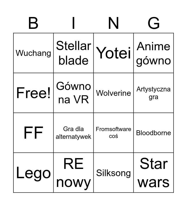 This bingo card has 16 words: RE nowy, Bloodborne, Yotei, Wuchang, FF, Stellar blade, Fromsoftware coś, Silksong, Free!, Gówno na VR, Lego, Anime gówno, Gra dla alternatywek, Artystyczna gra, Wolverine and Star wars.
