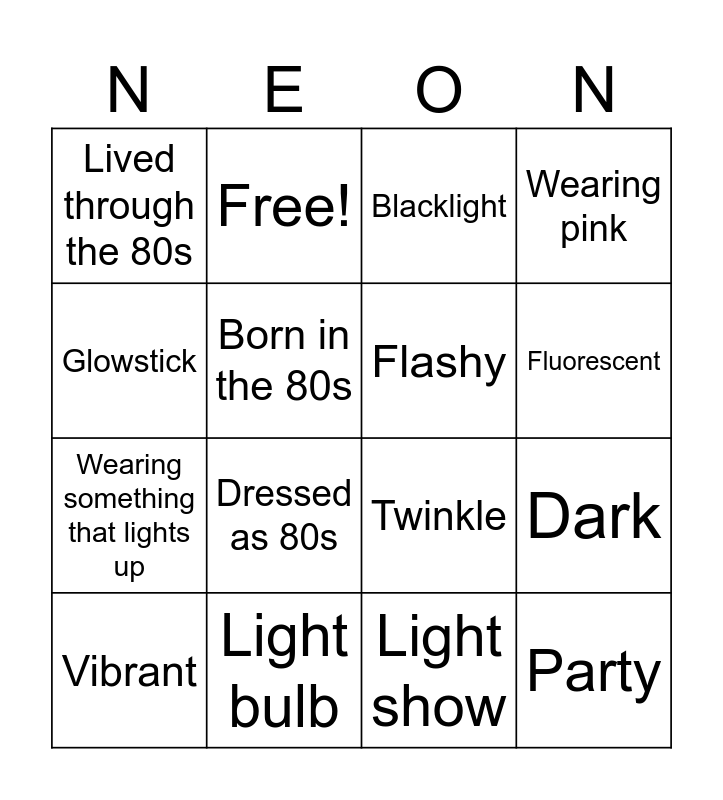 This bingo card has 32 words: Glow, Bright, Dark, UV Light, Party, Flashy, Glowstick, Shine, Free!, Colorful, Fluorescent, Blacklight, Sparkle, Illuminate, Light bulb, Prism, Glimmer, Twinkle, Neon pink, Neon green, Neon blue, Neon yellow, Light show, Vivid, Vibrant, Wearing pink, Wearing something that lights up, Born in the 80s, Lived through the 80s, Wearing neon green, Wearing leg warmers and Dressed as 80s.