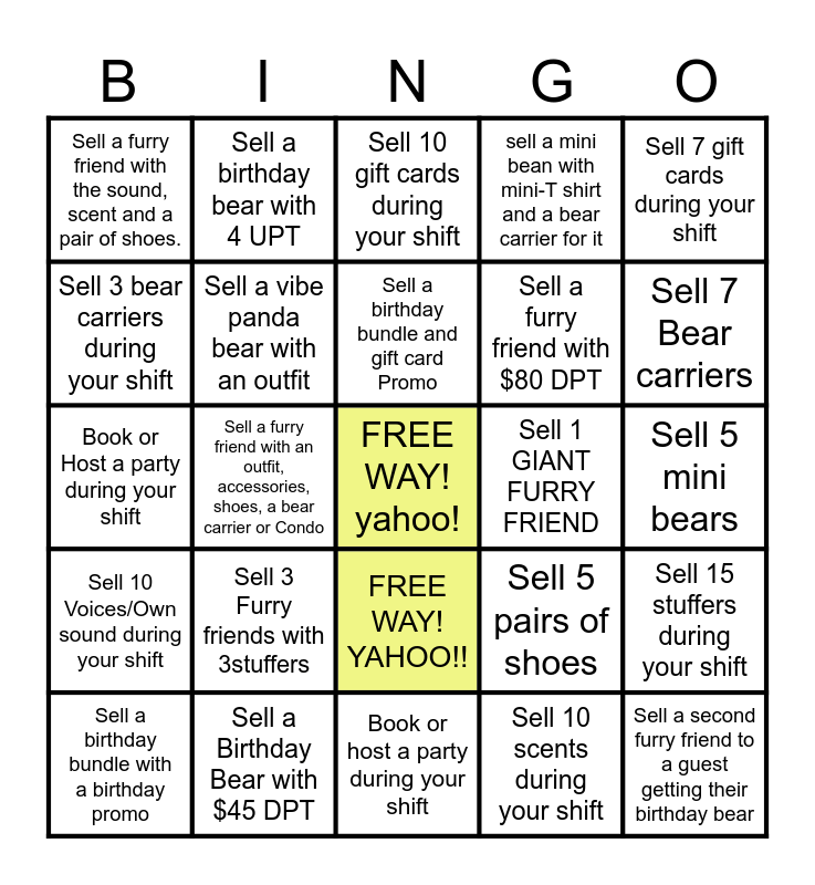 This bingo card has a free space and 24 words: Sell 3 Furry friends with 3stuffers, Sell a Birthday Bear with $45 DPT, Sell a birthday bundle and gift card Promo, Sell a birthday bundle with a birthday promo, Sell 7 gift cards during your shift, Sell a furry friend with the sound, scent and a pair of shoes., Sell 3 bear carriers during your shift, Sell a birthday bear with 4 UPT, Sell 1 GIANT FURRY FRIEND, FREE WAY! YAHOO!!, Sell a furry friend with $80 DPT, Book or Host a party during your shift, Sell 5 pairs of shoes, Sell 15 stuffers during your shift, Sell a vibe panda bear with an outfit, Sell 10 scents during your shift, Sell 5 mini bears, Sell 10 gift cards during your shift, Sell 7 Bear carriers, Sell a furry friend with an outfit, accessories, shoes, a bear carrier or Condo, Sell a second furry friend to a guest getting their birthday bear, Sell 10 Voices/Own sound during your shift, sell a mini bean with mini-T shirt and a bear carrier for it and Book or host a party during your shift.