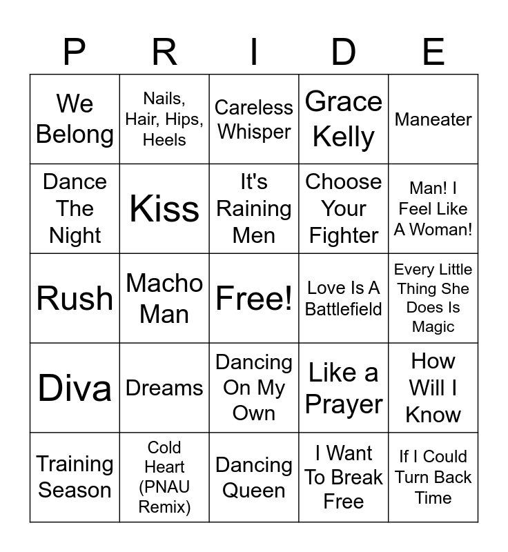 This bingo card has a free space and 31 words: Dancing Queen, Stayin' Alive, Macho Man, Islands in the Stream, We Belong, Careless Whisper, Kiss, Like a Prayer, Love Is A Battlefield, I Want To Break Free, Every Little Thing She Does Is Magic, If I Could Turn Back Time, Tell It to My Heart, What a Girl Wants, Man! I Feel Like A Woman!, Fantasy, How Will I Know, Dreams, Diva, Dancing On My Own, Maneater, Abracadabra, Training Season, Nails, Hair, Hips, Heels, Choose Your Fighter, Dance The Night, Grace Kelly, Rush, Cold Heart (PNAU Remix), It's Raining Men and Hung Up.