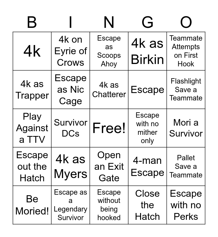 This bingo card has a free space and 24 words: 4k as Myers, Escape as a Legendary Survivor, 4k as Chatterer, Be Moried!, Teammate Attempts on First Hook, 4k, 4k as Trapper, 4k on Eyrie of Crows, Escape with no mither only, Open an Exit Gate, Escape, Play Against a TTV, 4-man Escape, Pallet Save a Teammate, Escape as Nic Cage, Close the Hatch, Mori a Survivor, Escape as Scoops Ahoy, Flashlight Save a Teammate, Survivor DCs, Escape with no Perks, Escape out the Hatch, 4k as Birkin and Escape without being hooked.