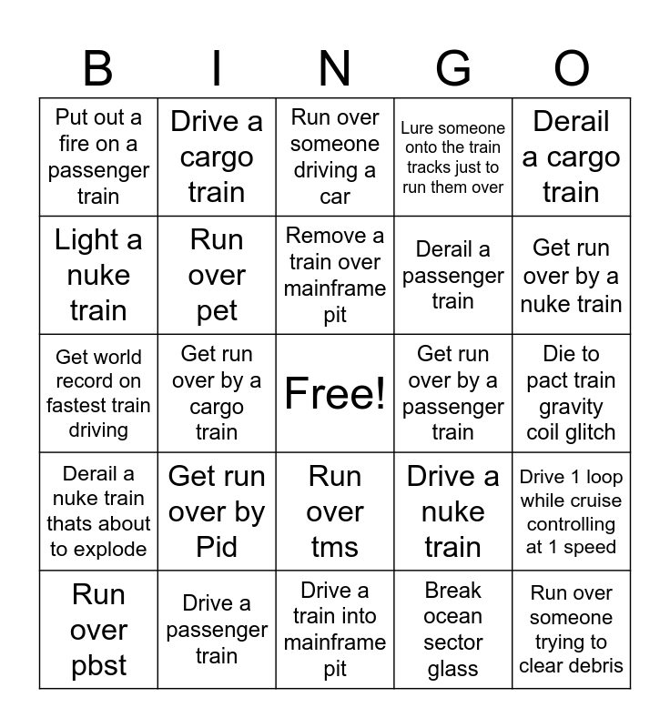 This bingo card has a free space and 24 words: Get run over by Pid, Drive a passenger train, Remove a train over mainframe pit, Run over pbst, Derail a cargo train, Put out a fire on a passenger train, Light a nuke train, Drive a cargo train, Get run over by a passenger train, Run over tms, Derail a passenger train, Get world record on fastest train driving, Drive a nuke train, Drive 1 loop while cruise controlling at 1 speed, Run over pet, Break ocean sector glass, Die to pact train gravity coil glitch, Run over someone driving a car, Get run over by a nuke train, Get run over by a cargo train, Run over someone trying to clear debris, Derail a nuke train thats about to explode, Lure someone onto the train tracks just to run them over and Drive a train into mainframe pit.