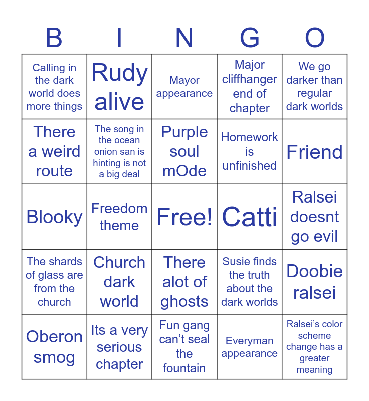 This bingo card has a free space and 24 words: Church dark world, Its a very serious chapter, Purple soul mOde, Oberon smog, We go darker than regular dark worlds, Calling in the dark world does more things, There a weird route, Rudy alive, Catti, There alot of ghosts, Homework is unfinished, Blooky, Susie finds the truth about the dark worlds, Doobie ralsei, The song in the ocean onion san is hinting is not a big deal, Everyman appearance, Ralsei doesnt go evil, Mayor appearance, Friend, Freedom theme, Ralsei’s color scheme change has a greater meaning, The shards of glass are from the church, Major cliffhanger end of chapter and Fun gang can’t seal the fountain.