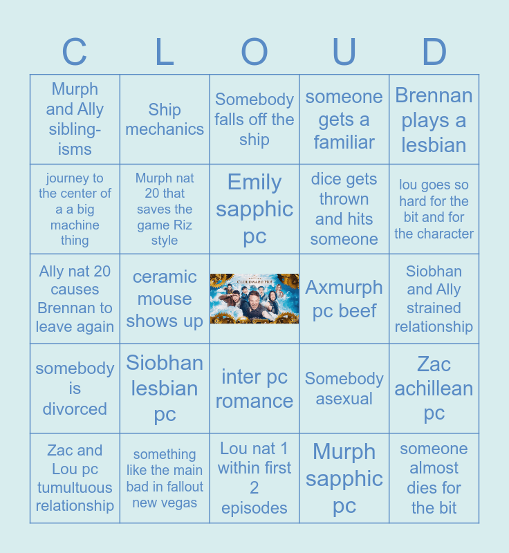This bingo card has a free space and 24 words: Zac and Lou pc tumultuous relationship, Siobhan lesbian pc, Emily sapphic pc, Murph sapphic pc, Brennan plays a lesbian, Murph and Ally sibling-isms, Ship mechanics, Somebody falls off the ship, Axmurph pc beef, Siobhan and Ally strained relationship, Ally nat 20 causes Brennan to leave again, Murph nat 20 that saves the game Riz style, Somebody asexual, Zac achillean pc, journey to the center of a a big machine thing, something like the main bad in fallout new vegas, Lou nat 1 within first 2 episodes, someone gets a familiar, lou goes so hard for the bit and for the character, somebody is divorced, ceramic mouse shows up, inter pc romance, dice gets thrown and hits someone and someone almost dies for the bit.